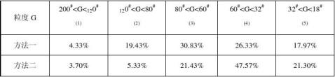 對(duì)顆粒粒度分布情況的數(shù)據(jù)和圖表進(jìn)行分析比較,可以看出方法二顆粒粗細(xì)比較均勻,基本上接近于正態(tài)分布,較為理想,60#<G<32#的顆粒 由方法一的26.33%提高到47.57%,而120<G<80的顆粒由