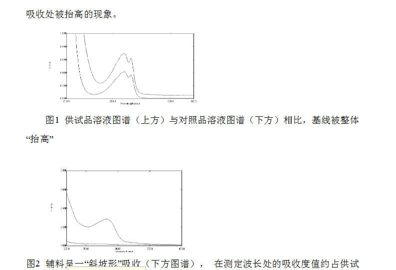 采用UV法測(cè)定前,一定要進(jìn)行紫外掃描,以考察輔料是否存在干擾。方法為:分別取對(duì)照品溶液和供試品溶液(濃度**好與對(duì)照品溶液一致或略低),進(jìn)行紫外掃描。著重觀察供試品溶液圖譜情況:是否存在基線被抬升的現(xiàn)象,以及與對(duì)照品溶液圖譜重合的情況。如輔料無(wú)干擾,則供試品溶液圖譜應(yīng)與對(duì)照品溶液圖譜基本重合或整體略低于對(duì)照品圖譜;如輔料有干擾,就會(huì)出現(xiàn)基線或末端