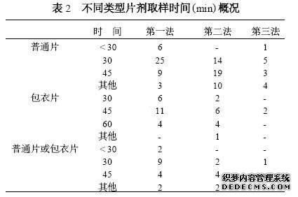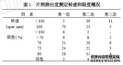 2. 2 藥物片劑或膠囊劑經(jīng)口服后須經(jīng)過崩解、溶解過程才能被機(jī)體吸收利用,溶出度測定較崩解時限檢查向吸收過程前進(jìn)了一步,但仍然需要經(jīng)過崩解過程。片劑根據(jù)其性狀的不同崩解時限規(guī)定有所區(qū)別,通常情況下普通片、薄膜衣片和糖衣片分別要求在15 ,30 和60 min 內(nèi)全部崩解。從表2中可以看出在溶出度檢查取樣時間的選擇上片劑性狀的差異沒有得到充分體現(xiàn),普通片45 min 及其以上時間取樣的約占45 % ,在普通片和包衣片并存時,只有鹽酸四環(huán)素片規(guī)定僅糖衣片檢查溶出度和鹽酸肼屈嗪片規(guī)定普通片30 分鐘、糖衣片60 min 取樣外,其余的都沒有加以區(qū)分。藥典規(guī)定檢查溶出度的制劑不再進(jìn)行崩解時限的檢查,在藥物的質(zhì)量控制中兩者之間存在一定的聯(lián)系,雖然溶出度測定在一定程度上取決于藥物的溶解性能,但如何體現(xiàn)劑型的特點也應(yīng)有所考慮。另外,鹽酸地爾硫芏卓片、格列齊特片和頭孢呋辛酯片及其膠囊采用了兩點取樣,規(guī)定了各自的限度要求,使溶出的速度和程度得到了充分體現(xiàn),其方法值得借鑒。